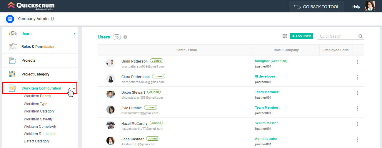 User can add workitem types and can also configure and customize existing and newly added workitem types. By default there will be three workitem types i.e. Story, Epic, and Defect.